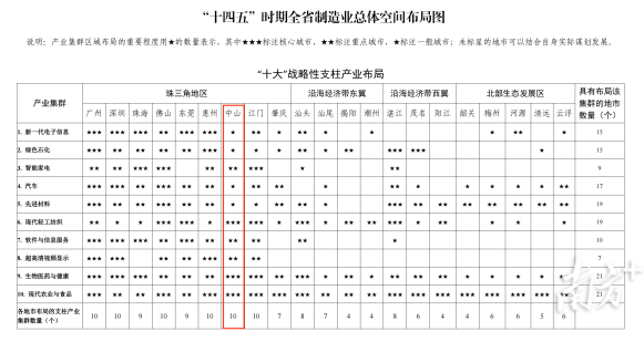 《規(guī)劃》中,共有68處內(nèi)容直接提及中山。在“十大”戰(zhàn)略性支柱產(chǎn)業(yè)布局和“十大”戰(zhàn)略性新興產(chǎn)業(yè)布局中,有19個產(chǎn)業(yè)將中山作為布局城市。其中,現(xiàn)代輕工紡織、生物醫(yī)藥與健康、現(xiàn)代農(nóng)業(yè)與食品3個產(chǎn)業(yè)將中山列為核心布局城市。