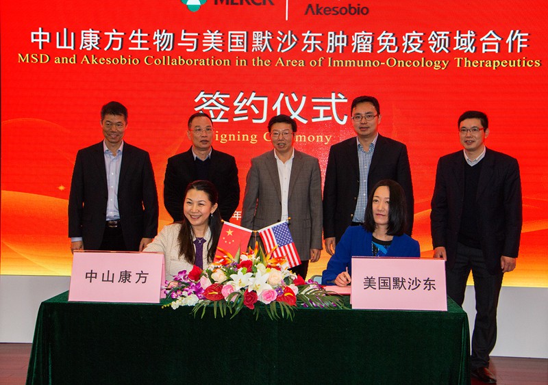 3月2日,中山康方生物有限公司董事長夏瑜博士和從美國總部專程前來的默沙東全球高級副總裁Xu Yuan博士就雙方在腫瘤免疫領域開展合作進行簽約儀式,市委常委、常務副市長謝中凡、火炬開發(fā)區(qū)管委會主任招鴻、中山市科技局局長尹明、火炬開發(fā)區(qū)總經(jīng)濟師梁兆華、國家健康基地副總經(jīng)理余從洪等共同見證簽約儀式。